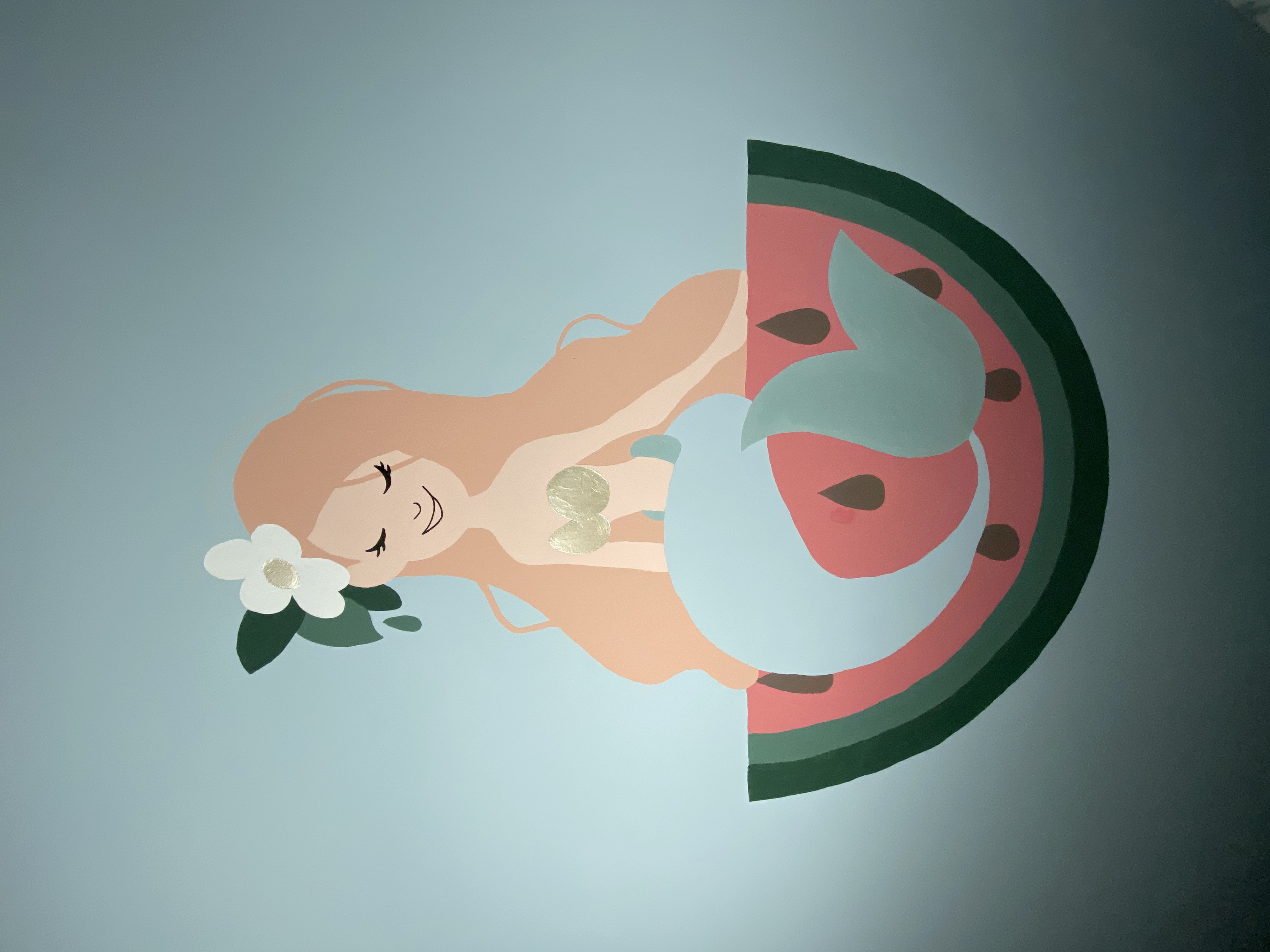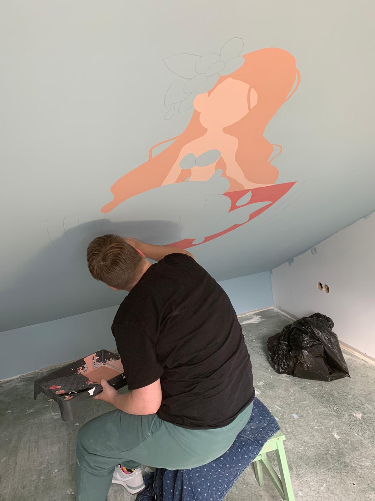 Voor deze muurschildering ontwierp ik een vriendelijke, fantasierijke zeemeermin, passend bij de belevingswereld van een jong kind. Het ontwerp brengt rust en verwondering, en sluit aan bij de kleuren en sfeer van de kamer.