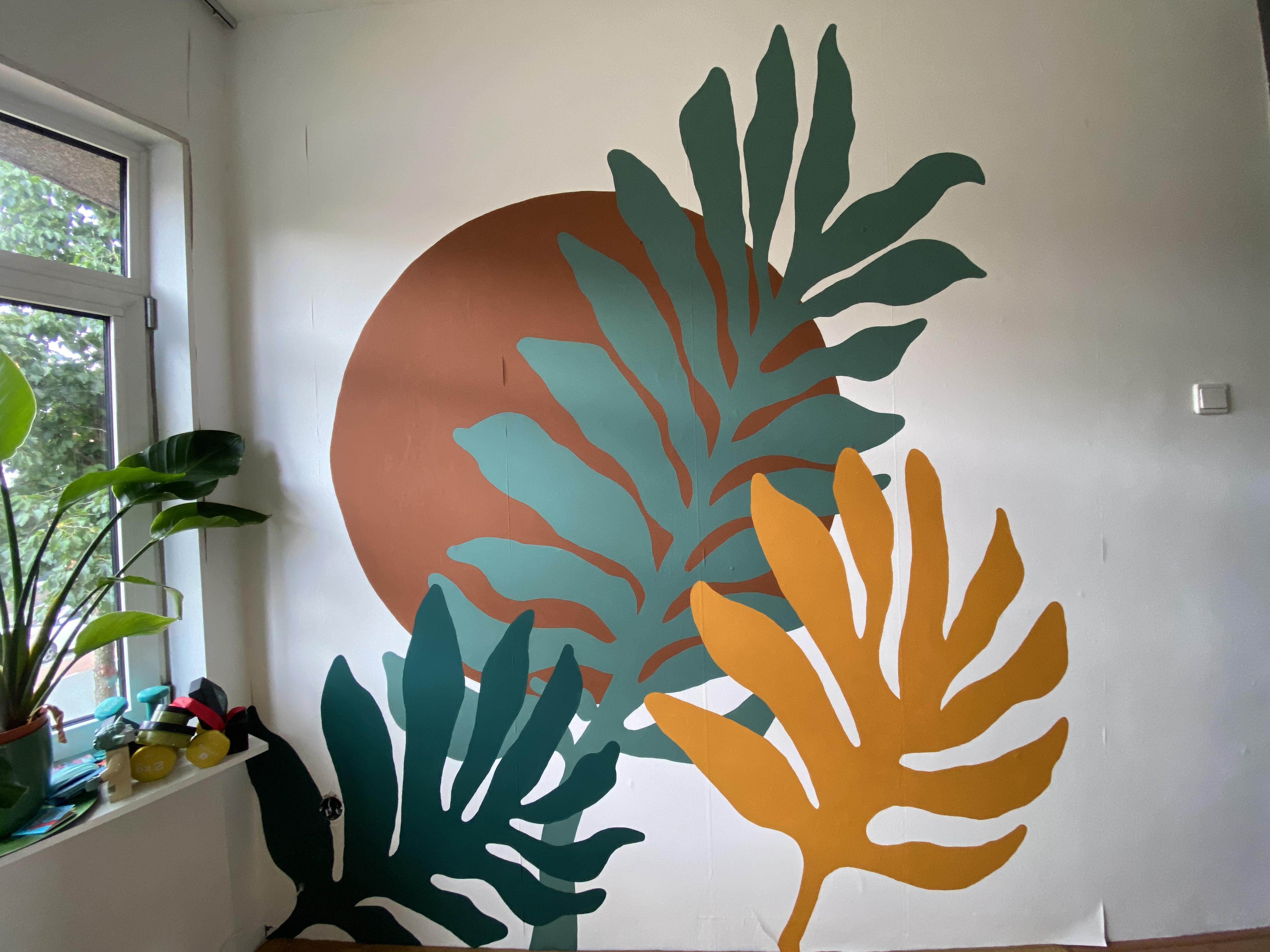 Een abstractere schildering, bestaande uit simpele bladvormen zonder schaduw of dieptewerking. De kracht zit in de minimalistisch, maar warm en decoratieve uitstraling. Ideaal voor een studeerkamer.