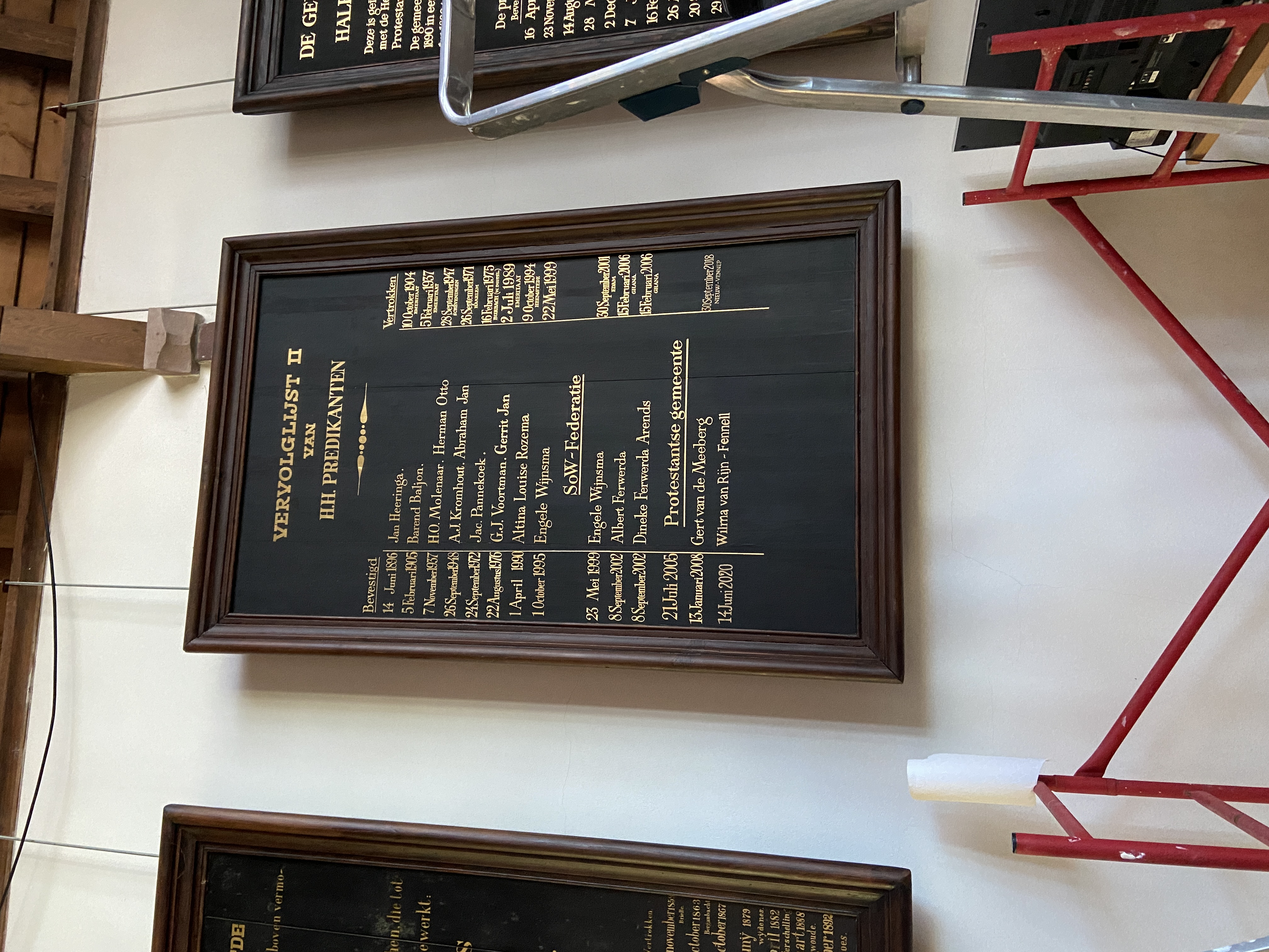 Op een groot houten bord in het kerkgebouw voegde ik de naam en jaartallen toe van een nieuwe dominee in het predikantenregister. De namen zijn met de hand geschreven in klassieke typografie, zodat het nieuwe deel naadloos aansluit bij de bestaande stijl.